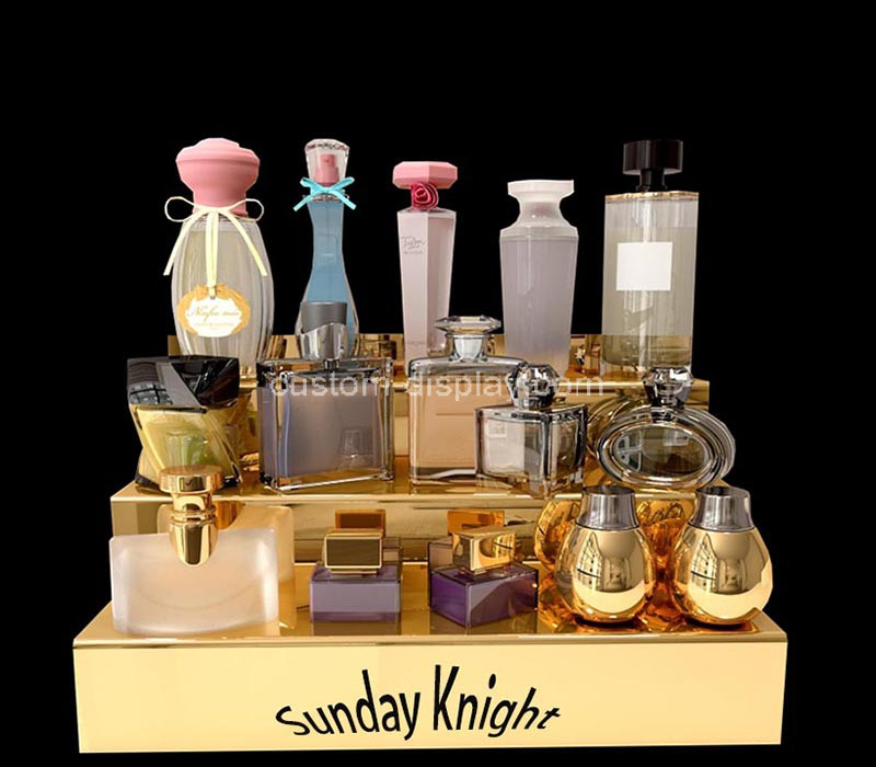 -Delivered, all taxes in. Custom gold mirrored acrylic 3-tier perfume display riser, ideal for elegant product presentation. Wholesale only, with a minimum order quantity (MOQ) required for bulk purchases. Perfect for upscale retail displays.