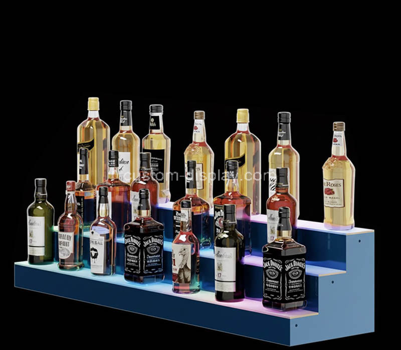 Custom acrylic 3-tier LED liquor bottles display shelf in blue and translucent white, designed to elegantly showcase spirits. Built-in LED lights highlight each bottle, perfect for bars, restaurants, or home use. Durable, stylish, and customizable with logos or colors for a modern display.
