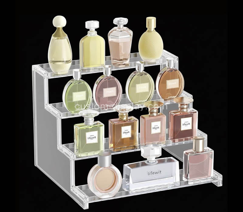 Custom translucent grey acrylic 4-tier perfume display riser features a sleek, modern design that elevates and organizes fragrance bottles with style. Crafted from high-quality clear grey acrylic, it offers durability and crystal-like clarity. The stepped structure maximizes visibility, making it ideal for retail counters, vanity tables, and showroom displays while saving space efficiently.