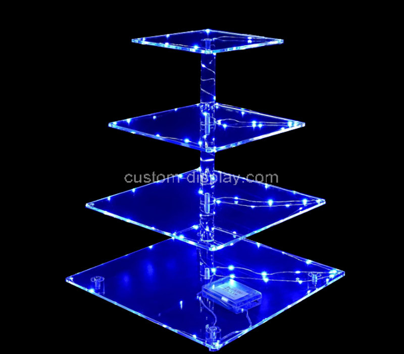 Custom acrylic 4 tiers LED party cake display stand crafted with clear, durable acrylic and vibrant lighting to highlight cakes at events, weddings, and parties. Stylish, stable, and fully customizable. Door-to-door, all taxes paid for a smooth and effortless delivery experience.