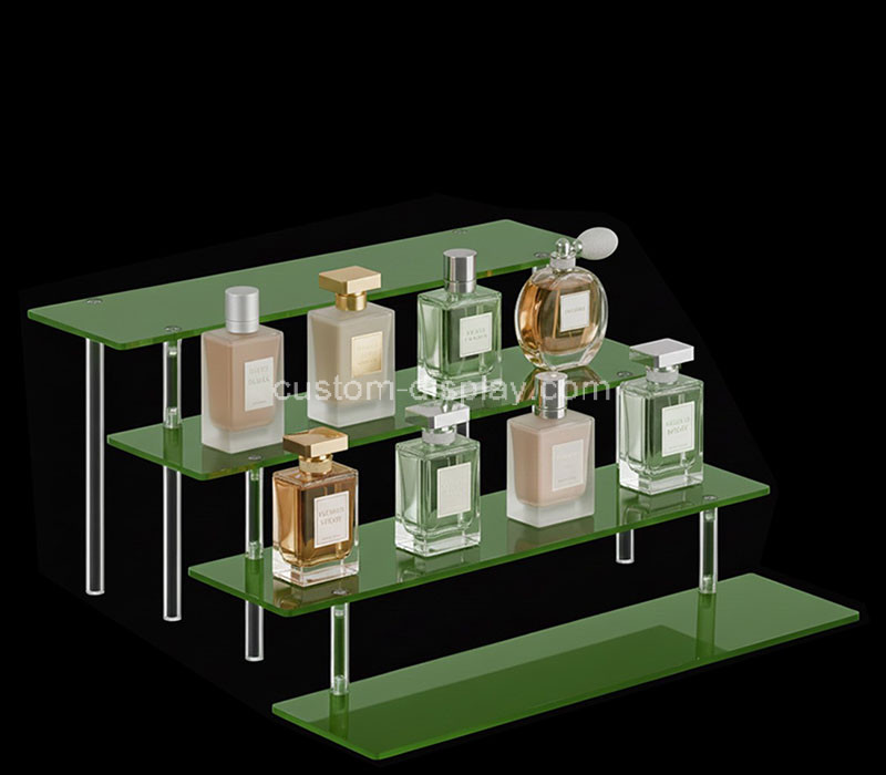 Custom acrylic 4-tier perfume display risers featuring a translucent green holder paired with clear legs for a clean, modern aesthetic. Perfect for showcasing fragrance collections in retail or exhibition settings. Your shipping cost includes all taxes and fees, ensuring smooth, worry-free delivery to the US, Europe, and select Asian countries.