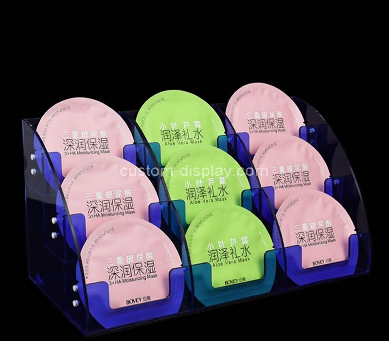 Custom translucent blue acrylic 9 pockets facial masks display holders are designed to keep skincare products neatly organized and easily accessible. Made from premium acrylic with a smooth, polished finish, they provide durability and modern appeal. The multi-pocket layout maximizes visibility, perfect for retail stores, beauty salons, and countertop promotions while maintaining a clean, professional display.