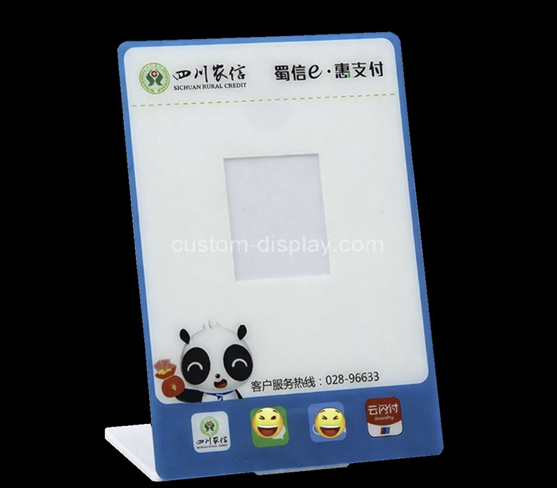 Custom acrylic countertop payment sign holder crafted from premium clear or colored acrylic for a sleek, professional display. Perfect for showcasing QR codes, payment instructions, or brand logos at checkout counters. Sturdy, stable, and easy to clean, ideal for retail stores, cafés, restaurants, and salons. Size, thickness, color, and printing are fully customizable to match your brand.