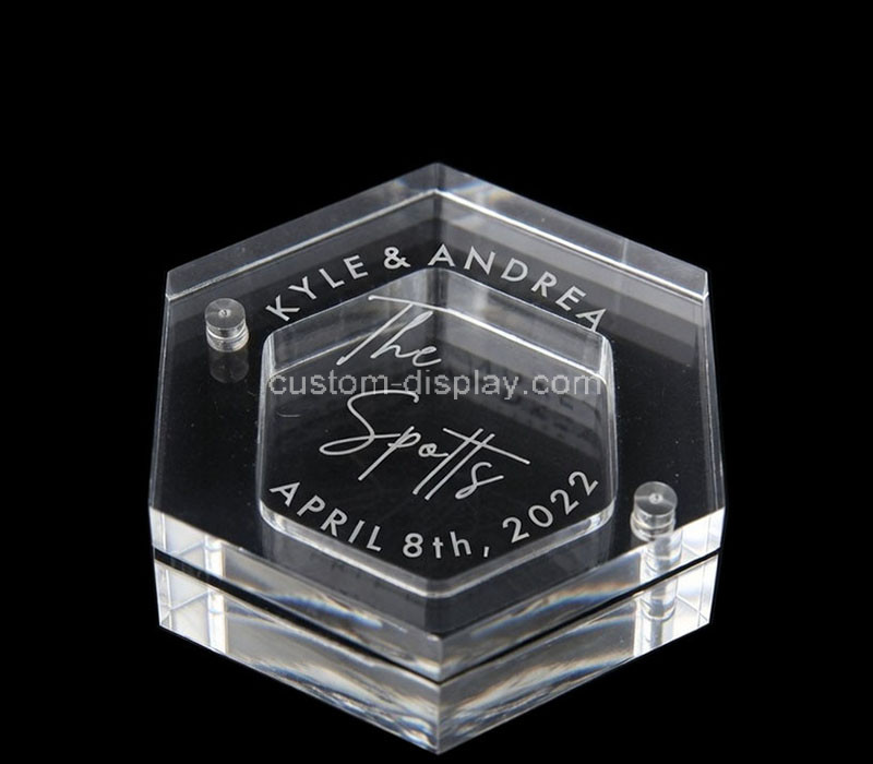 Custom acrylic hexagon jewelry gift packaging box with a magnetic lid, offering a unique and elegant presentation for your jewelry. The sleek hexagonal shape and sturdy acrylic construction provide both style and durability. The magnetic lid ensures secure closure, making it a perfect packaging solution for high-end gifts and special occasions.