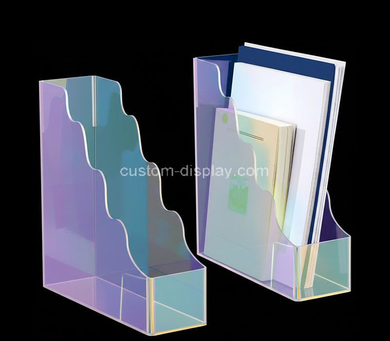 Custom iridescent acrylic office file holder featuring a modern, eye-catching finish. Crafted from durable acrylic, it keeps files, folders, and documents neatly organized while adding a sleek decorative touch, ideal for offices, home workspaces, reception desks, and professional environments.