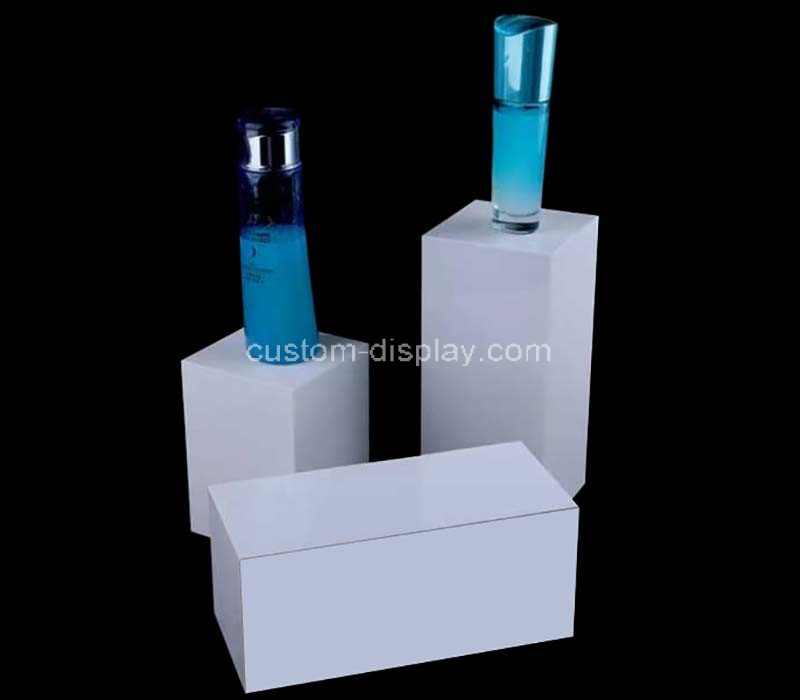 Custom white acrylic retail skincare display cubes, ideal for organizing and highlighting skincare products with a clean, modern look. Expertly handcrafted. Wholesale only, shipped directly to your door with all taxes and duties fully covered.