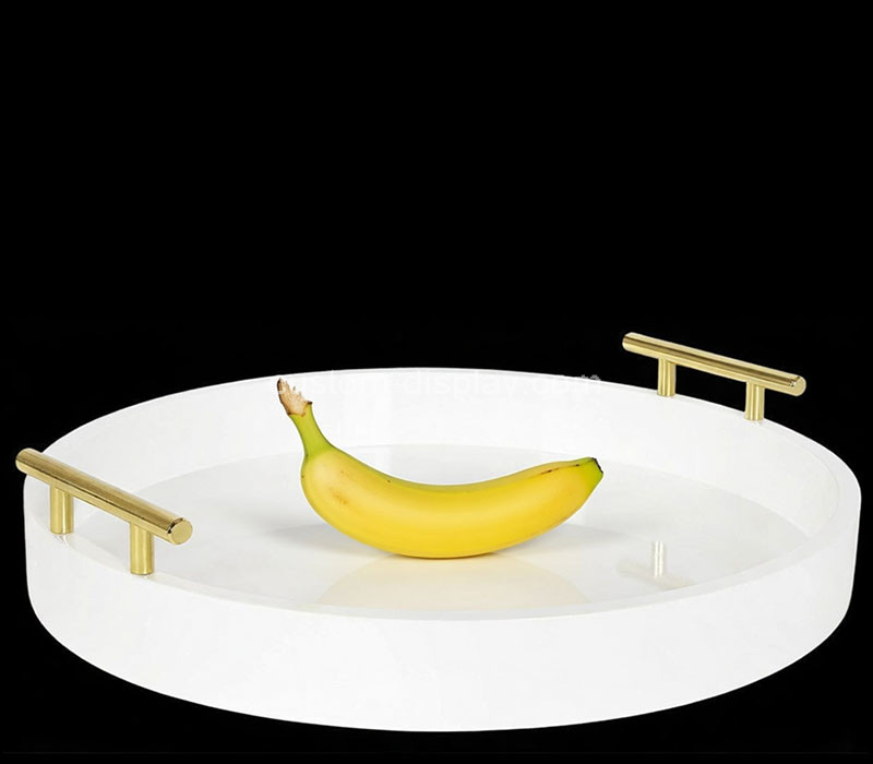 Custom white acrylic round tray for storage and display with metal handles combines elegance and durability. Ideal for serving drinks, organizing cosmetics, or retail presentation. Smooth polished edges ensure safety, while customizable size, color, and logo enhance branding and decorative appeal.