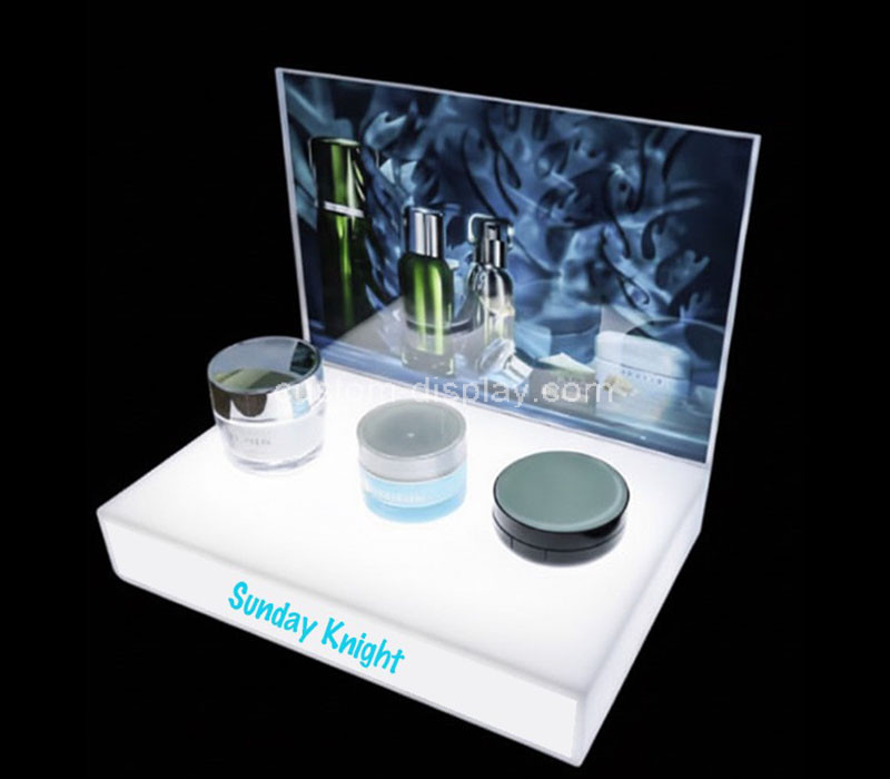 Custom acrylic skincare LED display props designed to showcase products with style and clarity. Featuring a durable acrylic structure and a UV printed backboard for vivid branding, this display combines modern aesthetics with integrated LED lighting. Ideal for retail counters or showrooms, it enhances product visibility and elevates the overall presentation.