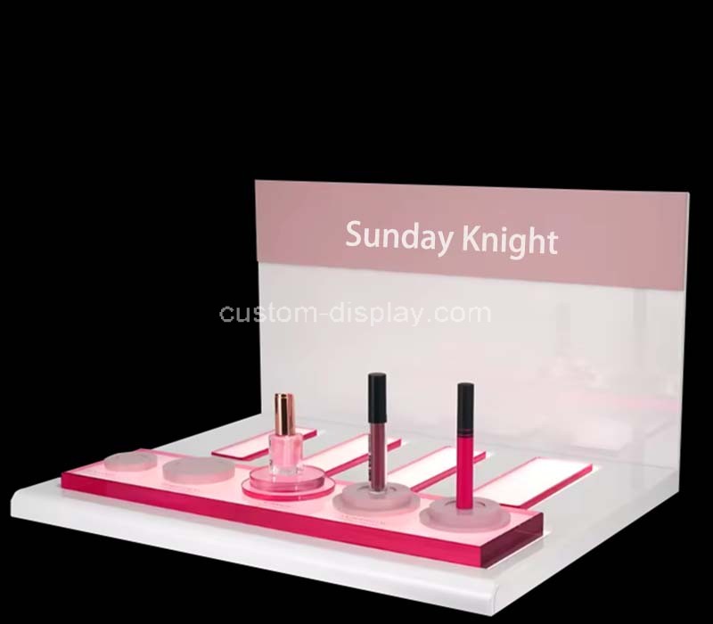 The wholesale custom black acrylic lip gloss display prop with backboard pattern printing is a sophisticated retail solution. This display stand not only organizes your lip gloss collection but also enhances its visual appeal with a stylish black and pink color scheme and a patterned backboard that catches the eye. Ideal for beauty stores, it's designed to make a strong brand statement.